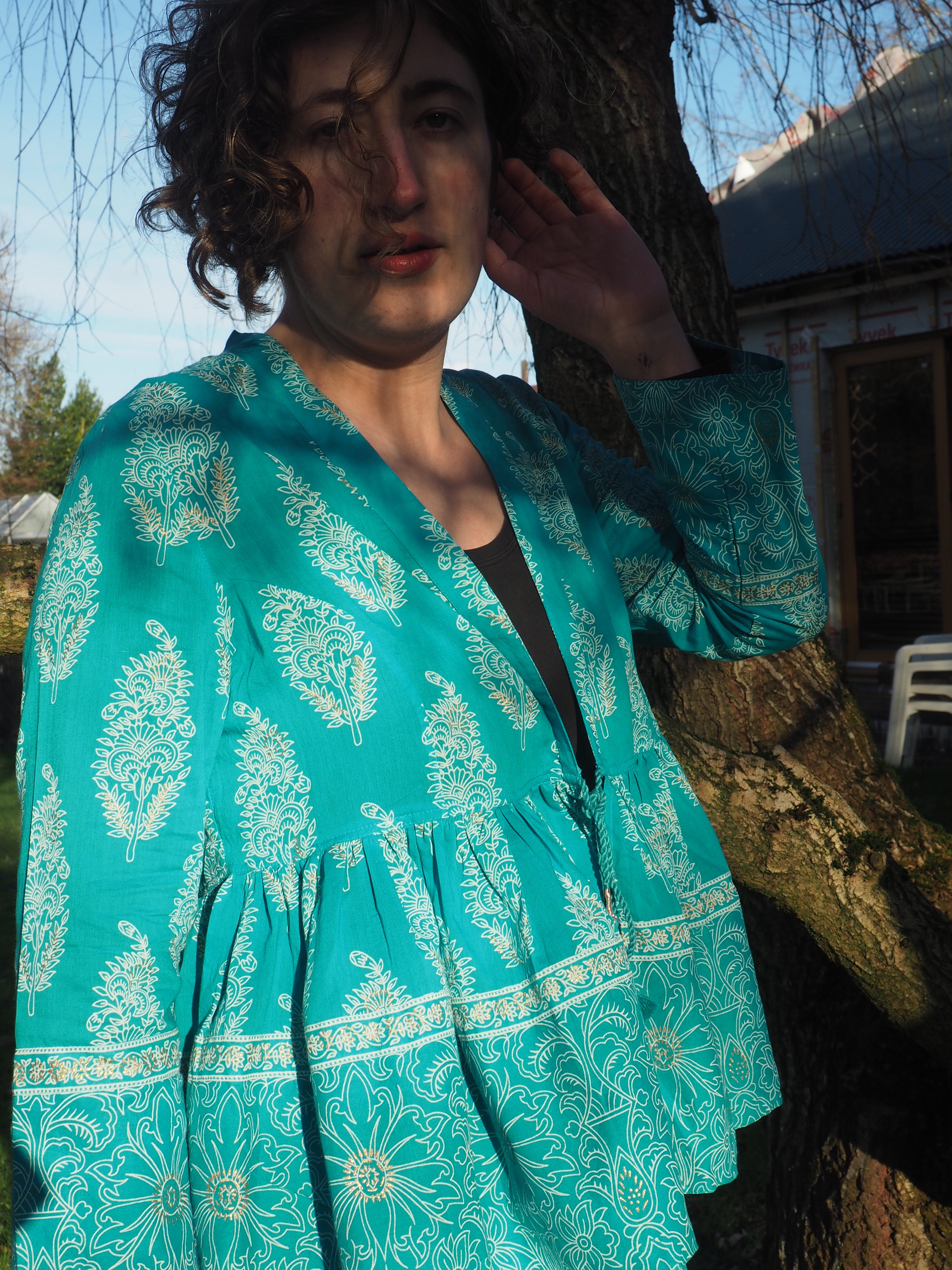 Pretty in Paisley - this beautiful turquoise jacket has voluptuous frills and embellished rope belt, with metallic block print detailing! Wear with matching turquoise crinkle skirt - or your fave white chinos!